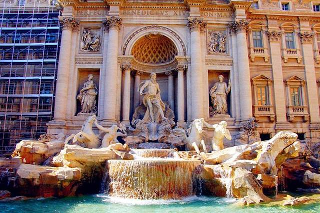 许愿池的全名叫做特莱威喷泉。早在公元前19年,喷泉就是古罗马人将贞女泉引进罗马城水道的终点。15世纪,这里又进行过一次大规模的整修,一直保留至今。喷泉主体部位的大理石海神雕像栩栩如生,细微处如海马们拉着的硕大的贝壳也处理得相当精美。据说背转身向池中投上一枚硬币就可以许三个愿望,但其中的一个必是“再回罗马”。