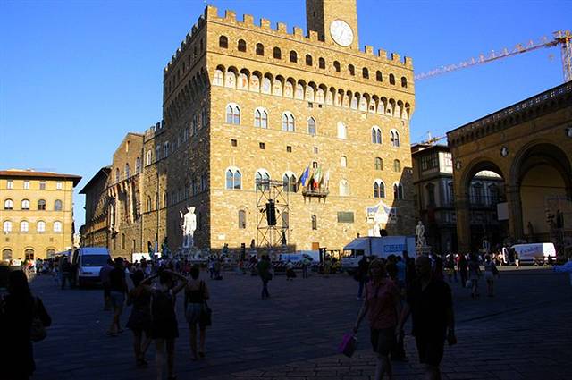 广场上有表现健美的海神喷泉,有领主敞廊和旧宫,该建筑建造始于13世纪末期,却1500年底才竣工。雄伟的宫殿前是有很多雕像的大台阶,在宫中建造的各样环境中,16世纪的大厅最为精美(里面保存着17世纪的挂毯和一些雕像,其中有米开朗琪罗的“维多利亚的天才”),百合厅和接见厅则藏有珍贵的挂毯。