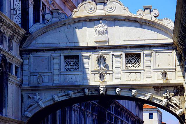 哀怨的叹息桥。 叹息桥建于1603年,因桥上死囚的叹息声而得名。据说恋人们在桥下接吻就可以天长地久,电影“情定日落桥”就在这取景的