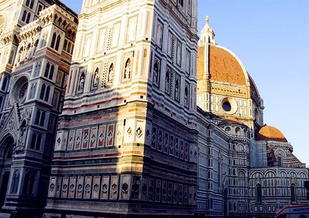 圣母百花大教堂”(花之圣母大教堂 Basilica di Santa Maria del Fiore ),被誉为世界上最美的教堂,是文艺复兴的第一个标志性建筑,被称为文艺复兴的报春花其圆顶直径达50米,居世界第一,是世界第四大教堂,意大利第二大教堂,能同时容纳1.5万人同时礼拜,教堂的附属建筑有洗礼堂和乔托钟楼。建于1296-1436年。花之圣母教堂在意大利语中意味花之都。大诗人徐志摩把它译作“翡冷翠”,这个译名远远比另一个译名“佛罗伦萨”来的更富诗意,更多色彩,也更符合古城的气质。