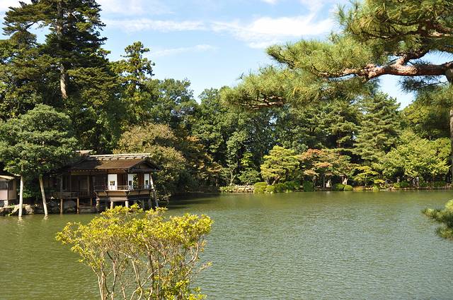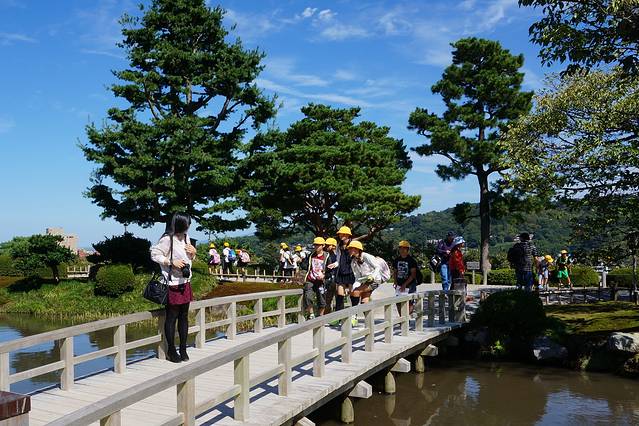 兼六园位于金泽市的中心附近,面积达11万平方米的园内,设置了池塘、喷泉、瀑布、溪流等景观,种植了松、枫、梅、樱、等树木、兰、菊、燕子花、草坪等花卉,加上亭、台、楼、阁等建筑,是一座回游式园林。它与冈山的后乐园、水户的偕乐园 齐名,称为日本的“三大名园”。被日本政府指定为特别名胜。