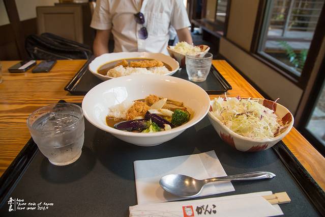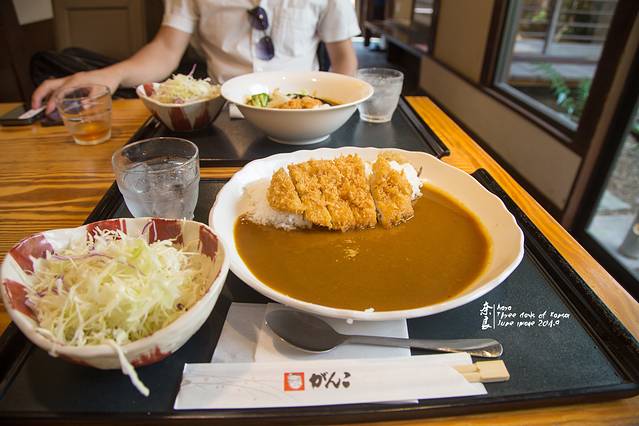 点了一份咖喱猪排饭、一份蔬菜鸡块饭。汤汁的味道不一样。鸡块饭的偏咸甜口。骏爷还是比较喜欢咖喱。咖喱味浓郁,但不会辣的慌。要不是京京提醒了好几次,骏爷真是要把汤汁都舔干净了,嘿嘿~对了,店里的蔬菜沙拉和红茶是无限量的。在这个蔬菜比肉贵的国度实在是难能可贵啊~赶紧补充纤维素!人均900日元(居然比拉面便宜( ⊙ o ⊙ ))。