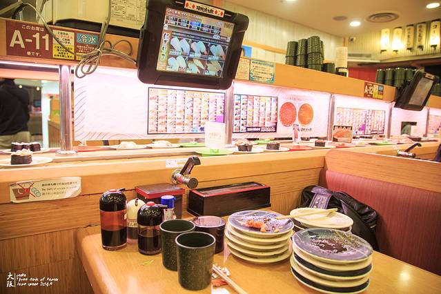 坐地铁回到了第一天到达的千日前,仿佛做了一个轮回一般,让人有点恍惚。选了一家叫“磯野渔太郎”全场100日元的回转寿司店。除了红盘和金盘是220日元以及一些酒水之外,全场100日元。(比国内便宜多少呀!!!!)可以在传送带上拿也可以在电脑屏幕里点餐。这是最后的战果,两个人吃了14盘。骏爷承认,主要是骏爷会吃!!