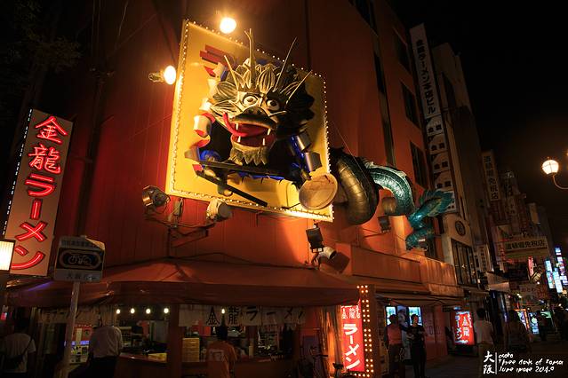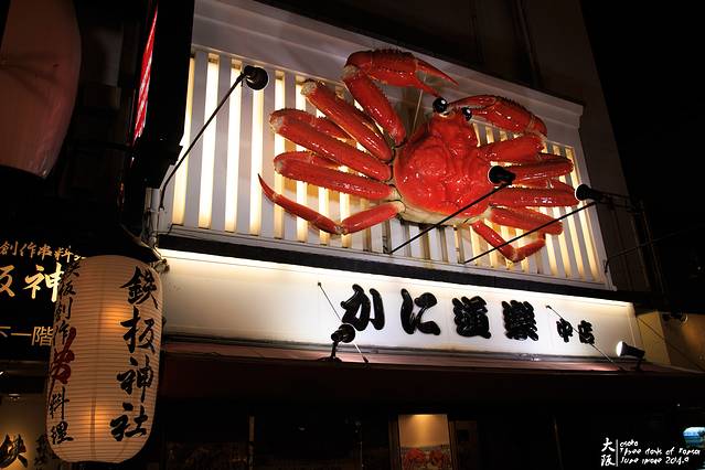 沿着千日前商店街大概走五六分钟就能到道顿崛,首先映入眼帘的就是蟹道乐那只大螃蟹,脚和眼睛居然都会动,太神奇了。晚上人少,清清爽爽地给这只大螃蟹拍张照,拿了中午菜单,决定明天中午从奈良回来之后吃个两千多日元的午市特惠套餐。