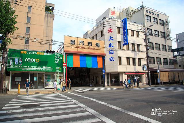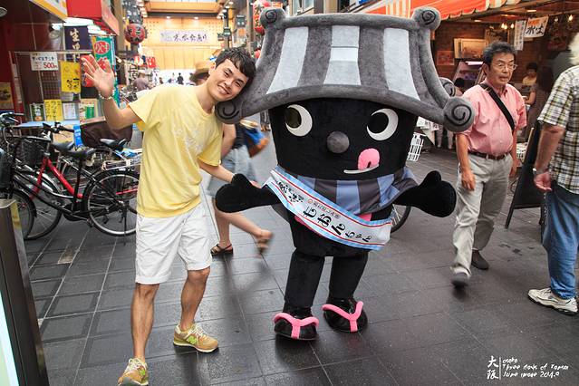 一出地铁站,直奔黑门市场。黑门市场9月底有个什么祭奠(海报上只看懂了“祭”这个字),所以有人拉着黑门市场的吉祥物(日本各种地方都有各种吉祥物啊~)宣传。骏爷赶紧上去合照,只是这没睁开的眼睛、痴傻的表情······喂喂喂,京京同学,你这是在报复刚刚那张跟鹿的合影么?○| ̄|_(京京:这孩子又演上了~)