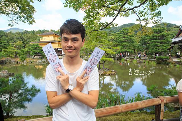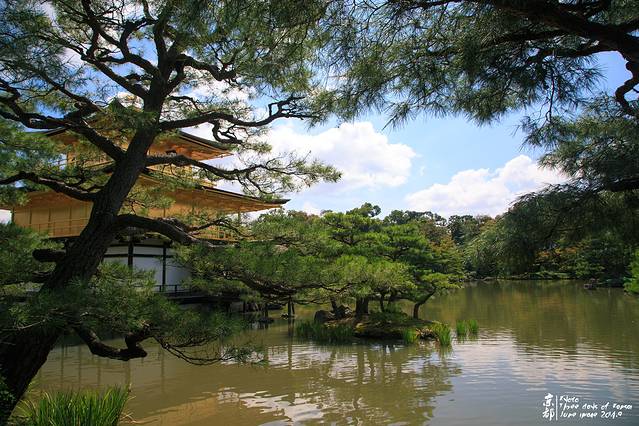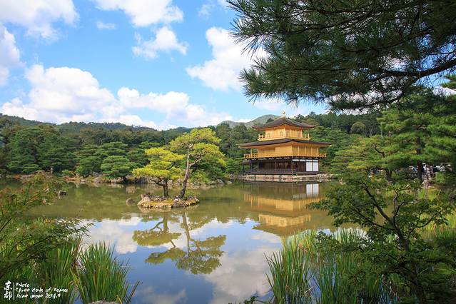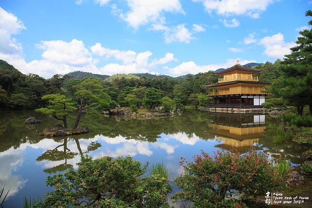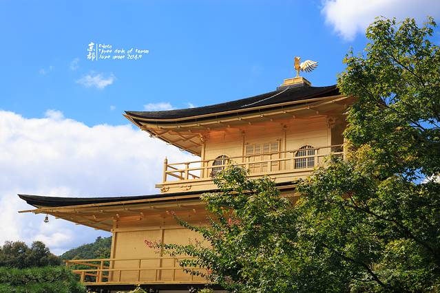 其实,80后对金阁寺都应该有印象。因为一休哥里的就是金阁寺。金阁寺本名鹿苑寺,只是大家习惯叫金阁寺。外面贴满金箔。每层楼都是不同的建筑风格。一楼是延续了当初藤原时代样貌的“法水院”(属寝殿造风格,也就是平安时代 的贵族建筑风),二楼是镰仓时期的“潮音洞 ”(一种武家造,意指武士 建筑风格),三楼则为中国(唐朝 )风格的“究竟顶”(属禅宗 佛殿建筑)。寺顶有宝塔状的结构,顶端有只象征吉祥的金凤凰装饰。(来源网络)