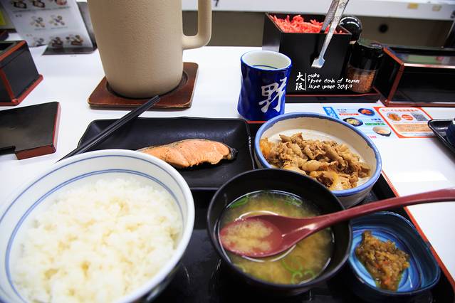 本来打算直接回大阪吃蟹道乐的午市特价套餐(2000+日元/人)。可是早上那片吐司怎么能填饱旅行模式下骏爷的胃呢。于是,在巡了一遍步行街后选了这家餐厅(名字真的不会叫,就看图片里的logo吧),准备稍微填下肚子再回去。后来才知道,这家餐厅在日本也是比较有名的连锁店,早早就出现在骏爷日本拍的第一张照片里了(单反)。可能这就是缘分吧······