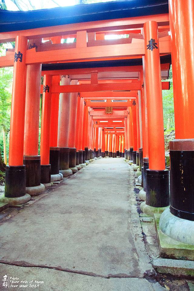 (网络注释:鸟居是一种类似于中国 牌坊的日式建筑,常设于通向神社 的大道上或神社周围的木栅栏处。主要用以区分神域 与人类所居住的世俗界,算是一种结界,代表神域的入口,可以将它视为一种“门”。在日本各地的神社之中,因鸟居而闻名并排名第一的应是位于京都的伏见稻荷大社。在这个神社中,有人许愿就敬献一座鸟居,使得门前有许多鸟居排列成一个长长的甬道,被称为“千本鸟居 ”(右图)。除此之外,位于广岛县 的严岛神社 之海上大鸟居,也是常被用来象征日本传统信仰文化的知名鸟居之一。)