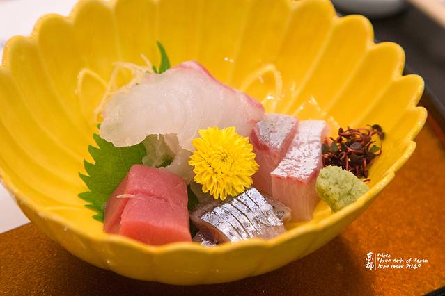 在三口解决了前菜之后,起码等了十分钟才上了刺身拼盘。大菊花里有朵小菊花,真不愧是秋季限定!!