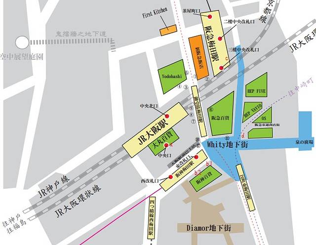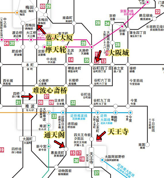 这个是大阪几个主要景点的地铁换乘图。截图来自大阪周游卡的使用指南。大家可以到大阪的官网上下载。这个网站有关大阪的信息,包括地铁图啊,景点介绍啊,美食推荐啊~可以说是应有尽有了。http://www.japan-osaka.cn/ch/