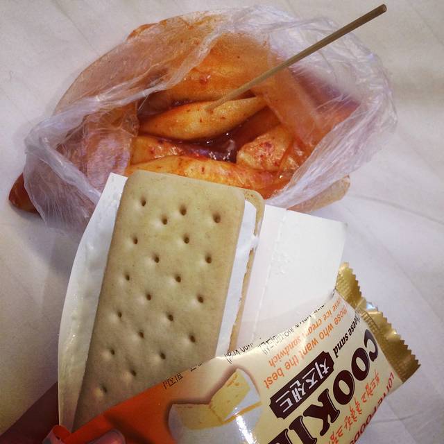 回酒店后继续夜宵,去韩国一定要去便利店买棒冰尝尝啊,下面照片上的夹心饼干其实是冰淇淋,个人觉得口感很好。