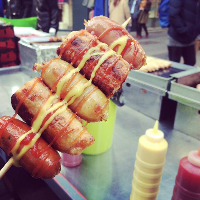 明洞有很多小吃,下面这个小香肠很好吃,总体物价比国内要高。