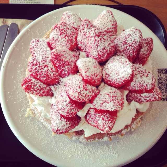首尔有名的草莓华夫饼,端上来好大一个,折合人民币90元。