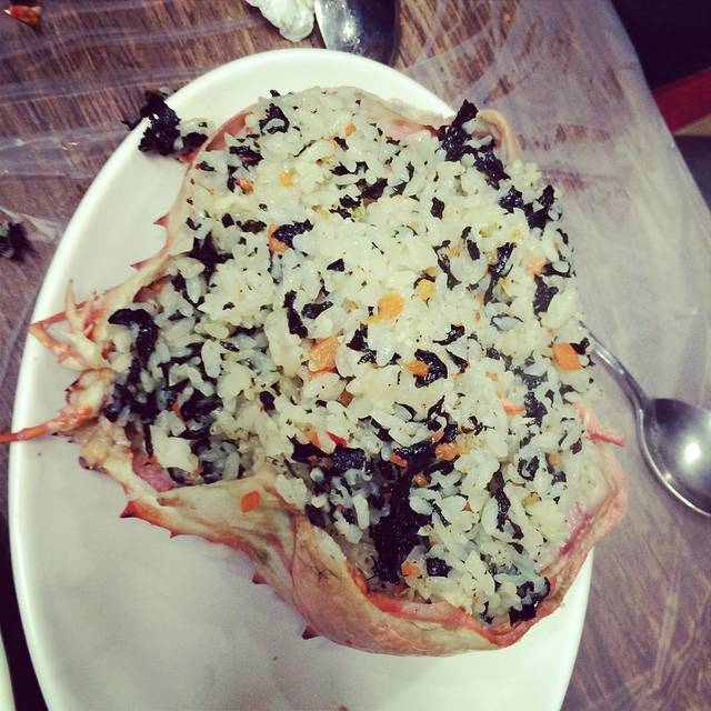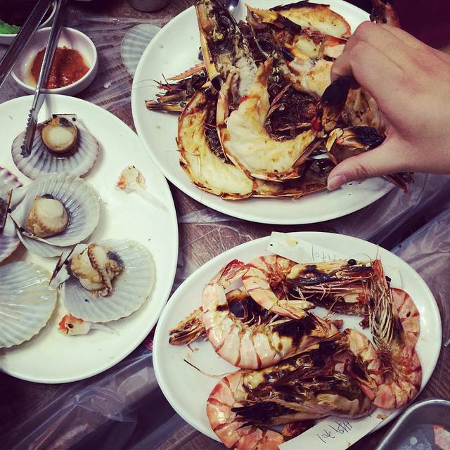 我们一行人买完东西就去2楼的海鲜加工店加工了,很美味。吃了一只大螃蟹,每人一只大虾,一盘扇贝,一盘小虾,一盘香螺,一盘章鱼,3份炒饭。折合人民币人均180。