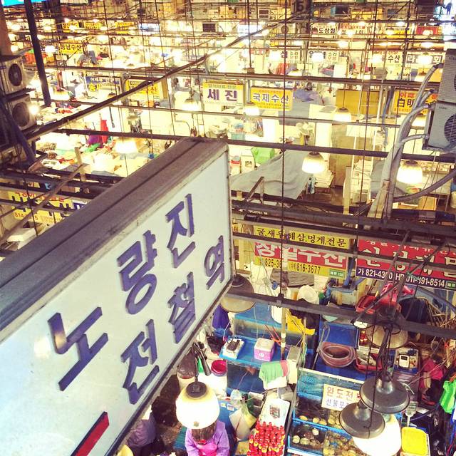 交通:从地铁1号线鹭梁津(Noryangjin)站的检票口出来后,马上从右侧的出口出来。上台阶,过人行天桥。过人行天桥后,左拐进入左侧的建筑里,沿台阶下至1层就是。