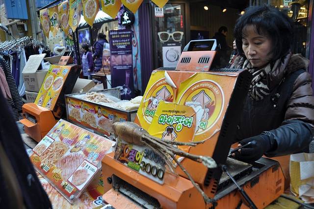 明洞街头的鱿鱼饼,闻起来很香,其实味道是甜的。
