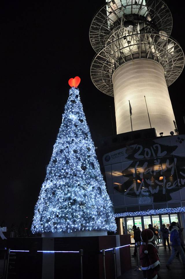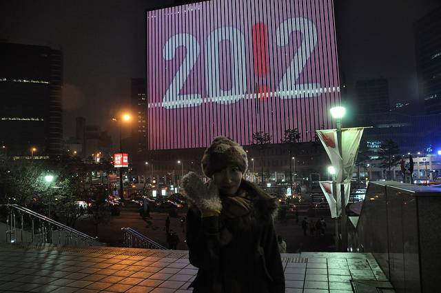 据说首尔站的乐天玛特11点关门,我们也差不多11点才到,一通大采购后,伴着大俗的背景音乐《回家》结了帐,拎着大包小包出来的时候,正好赶上首尔站广场的大楼上开始最后1分钟的count down, 平台上人并不多,最后10秒大家一起倒数,迎来了新的一年。我们在闪亮的“2012”下合了很模糊的影,轮到给Paul照的时候,灯光消失了,夜空又恢复了寂静,Paul很失望,哎,这个点背的小可怜。