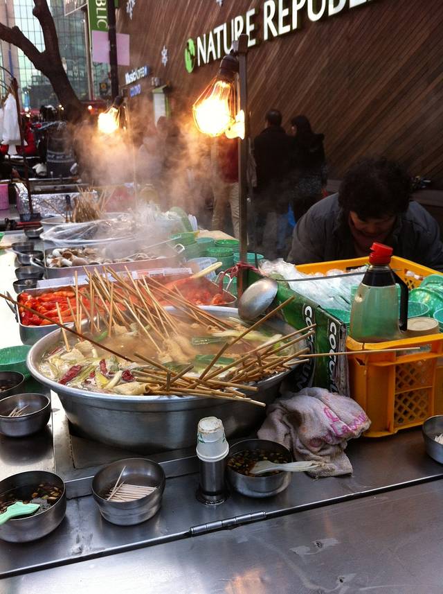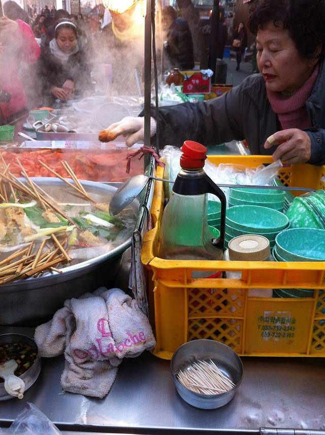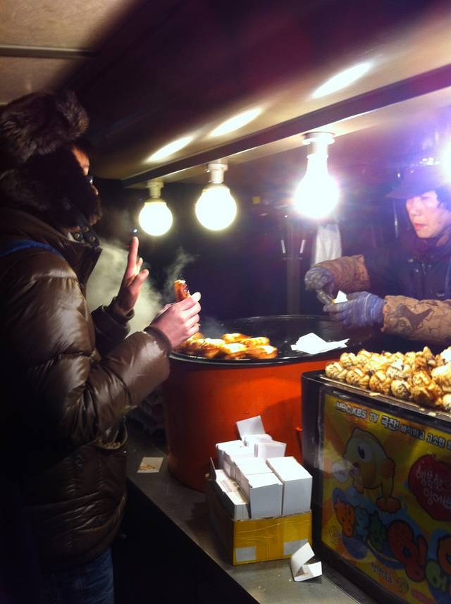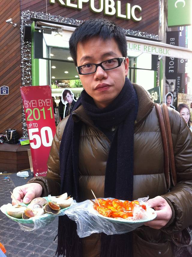一到明洞,我们首先就冲着一个路边摊去了,问也没问价钱就要了份年糕和螺,一给钱才知道那个螺要一万韩元,基本上相当于吃个正餐了。和路边摊的小吃相比,我更喜欢喝它的汤,可能因为每次我都很口渴。在首尔的每一天我几乎都要吃年糕,就像在南京每一天都要吃碗鸭血粉丝汤一样。