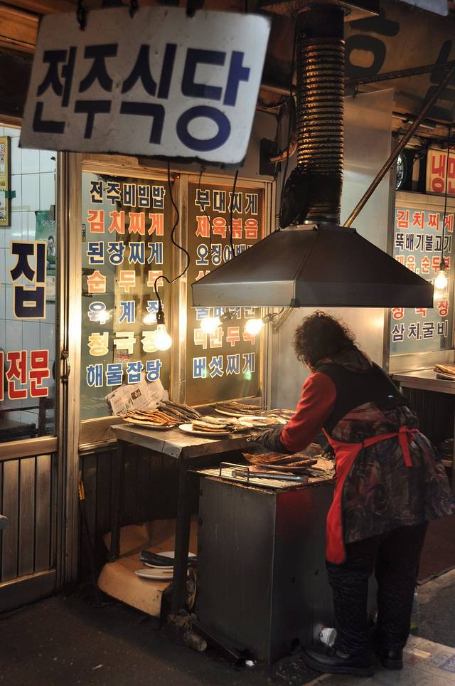 我们在东大门的美食街吃了推荐的烤鱼,美食街离doota还很远,需要沿清溪川走一段路,那条街杂乱而狭小,但很有市井的感觉。烤鱼一餐便宜又美味,比街边摊的螺还价低,我们吃的饱饱的,前往更令人失望的南大门。