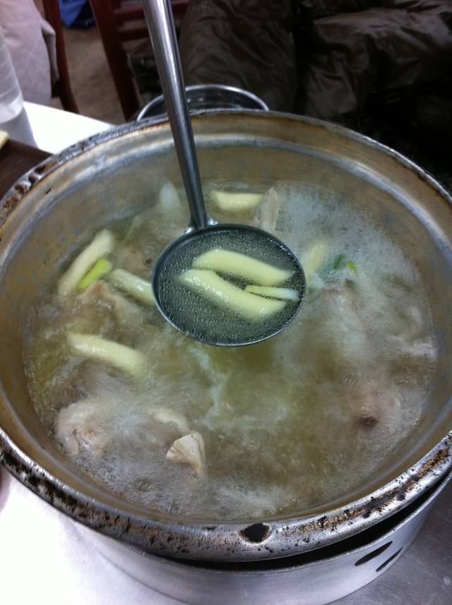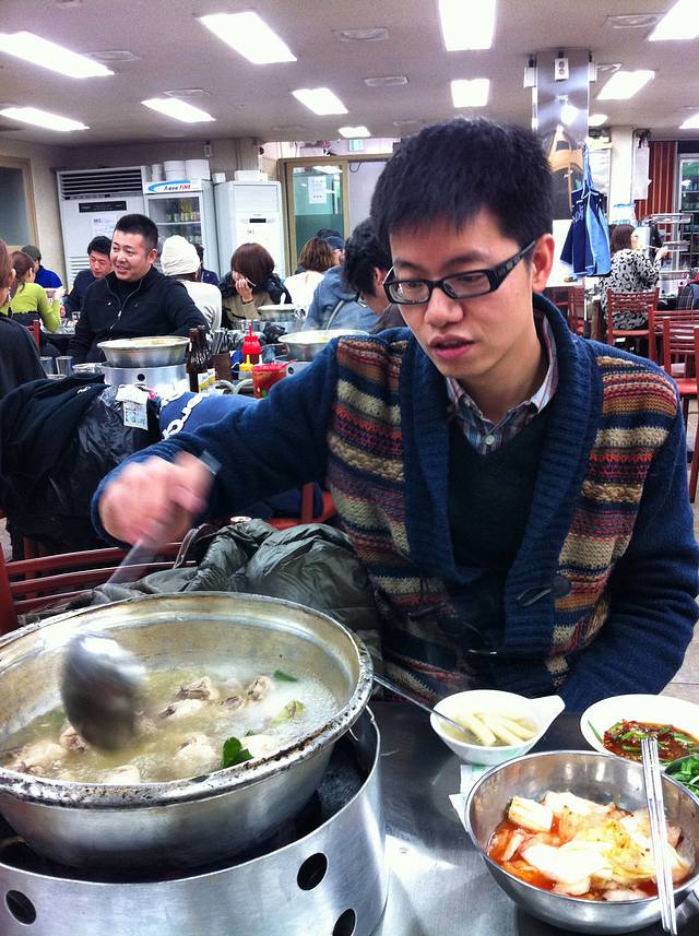 晚上,我们又折回东大门的美食街,想去吃陈玉华奶奶的一只鸡,但我们搞错了地点,于是就吃了另一家同样是参鸡汤的店。不知道是晚上还是假日的缘故,东大门十分冷清,哪里有旅行书中介绍的通宵营业的壮观场面,连昨天吃的烤鱼店都关门了。