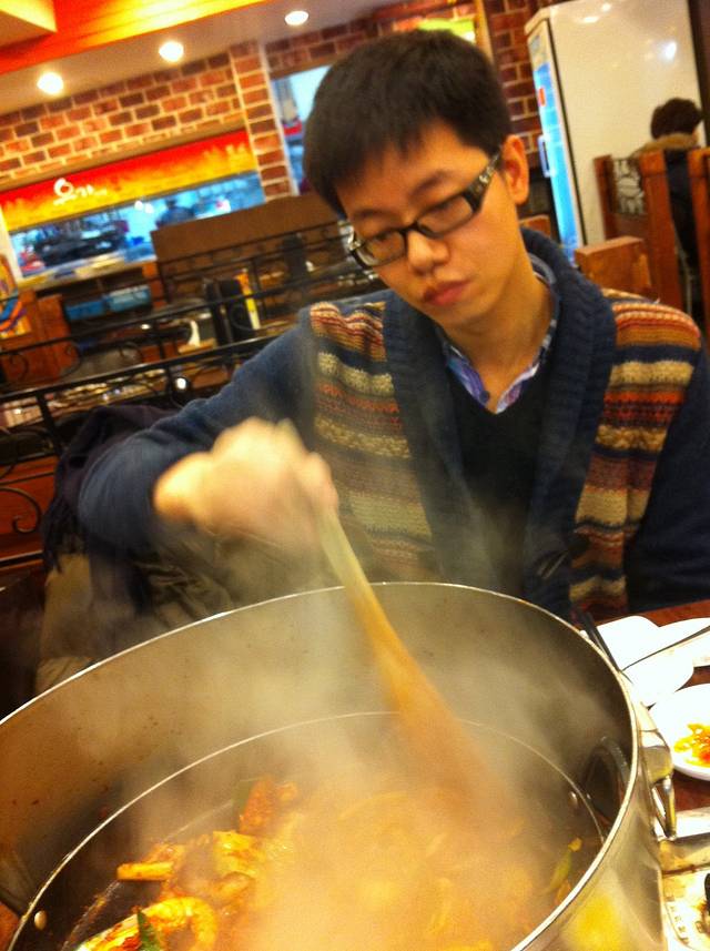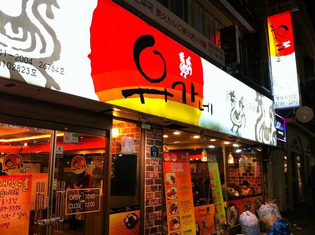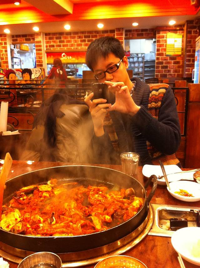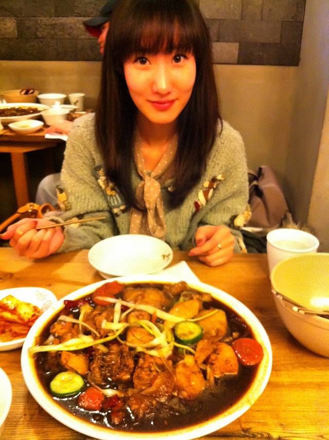 返回明洞,选定了一家招牌很眼熟的炒辣鸡吃晚餐,不知道这跟传说中的春川超辣鸡是不是相同味道。我们选的海鲜锅好像是2万4千韩元,里面有鸡、虾、鱿鱼和青口,但最好吃的还是鸡肉,所以应该只点鸡肉锅就好了,只要8千韩元,比那街边摊的螺丝还便宜。吃完肉,再点饭,混着酱炒,味道一样好。点了饭,我还嫌不过瘾,又加了份土豆粉,才满意地离去。