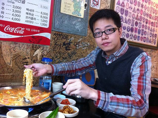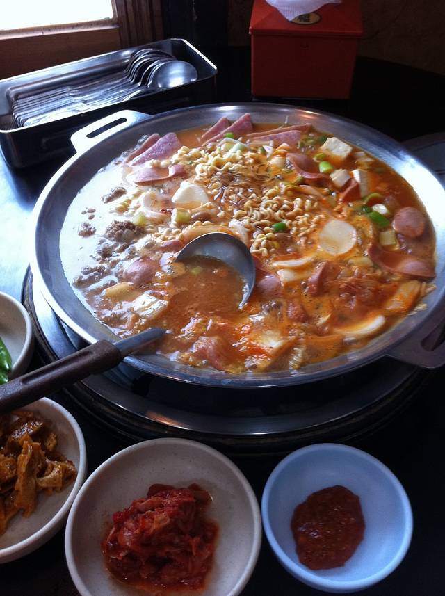 从梨花大学往新村方向走,随便进了家店吃部队锅。部队锅这种东西不吃也猜到是什么味道什么口感,吃了也不会有惊喜。我就在浮想联翩,如果我开食肆,也可以开部队锅店,因为这也太简单了吧。
