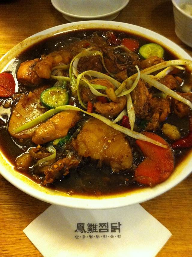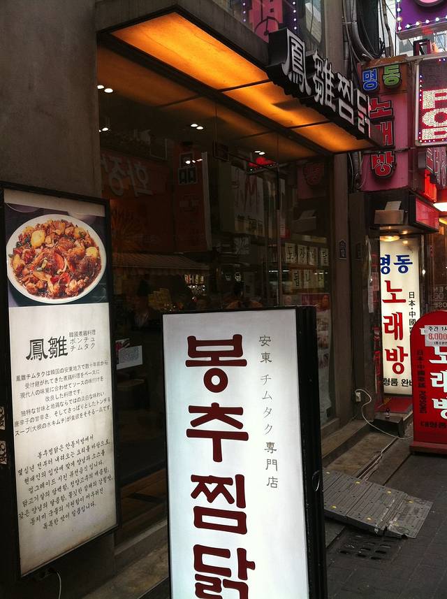 又拎着大包小包到了明洞,直奔那家出名的牛肉汤——河东馆,普通的牛肉汤1万韩元、特别1万2千韩元,我们因为还要再吃一顿,所以想买一碗尝尝,但是老板娘不卖一碗,于是只好各买了一碗。其实就是肉汤泡白饭,特别的有那么三五块牛肉、一两块牛肚,普通的只有三块牛肉, 味道也很一般(五星不推荐),我这种重口味觉得没什么意思,情愿去喝兰州拉面的汤,于是我们只随便喝了两口,饭也没吃,就去了另一家也是旅行书推荐的凤鸡。