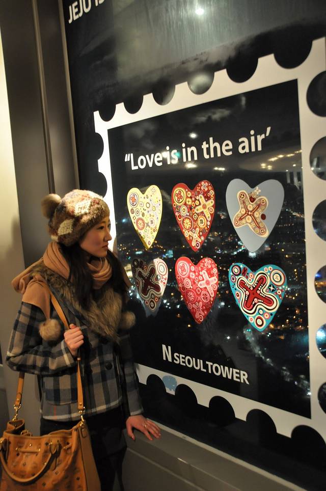 水原一来回又是大半天(因为中午才出门),上南山时已经赶不上夕阳了。我们从明洞新世界过去的玻璃扶梯上到缆车,没费力气就达到了首尔塔。本来只想去泰迪熊博物馆,但因为有套票也顺便去了观景台。