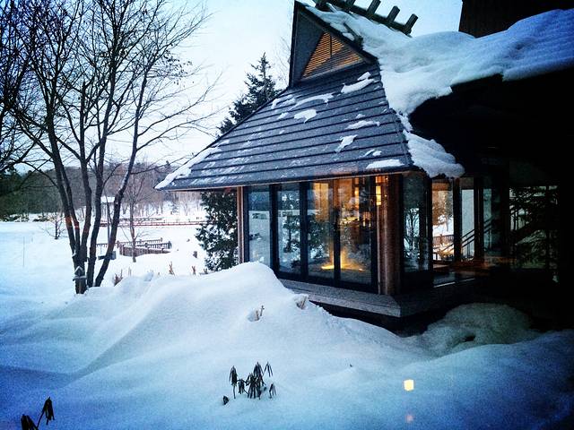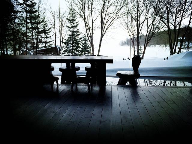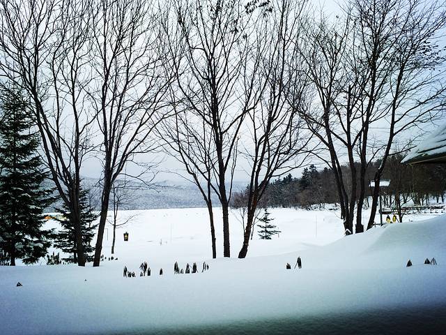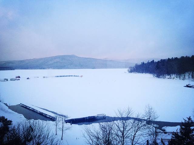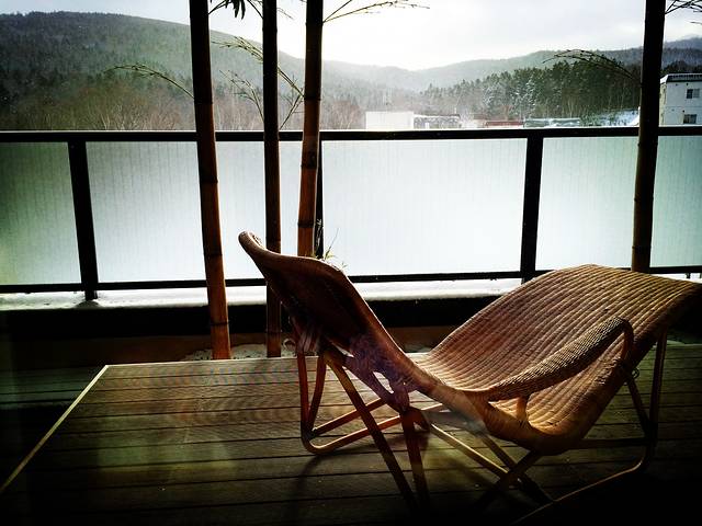 今日有雪,阿寒湖全线结冰,冰面上搭着帐篷,似乎是用来凿冰垂钓。在阿寒的几天行程都特别松散,因为主要目的是放松,所以一味吃吃睡睡,把特地带来的唱片拿出来听,看书,到附近闲逛,整理照片。因为昨天入住时对房间格局十分满意,遗憾当时在booking上只订了普通房,风景到底有限,于是咬咬牙升级到湖景房,可以和大堂一样看到一整片白茫茫的阿寒湖。工作人员通知上午十点完成换房,于是早起先泡汤(看,又是洗澡),再次感受头顶飘着飞雪身体泡在热水里的奇特感觉,泡完就去旁边的小房间汗蒸,然后喝一杯冰牛奶,皮肤滑滑的,整个人顿感通透。