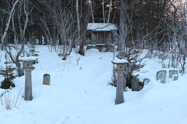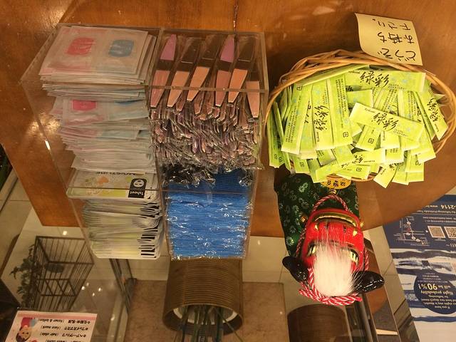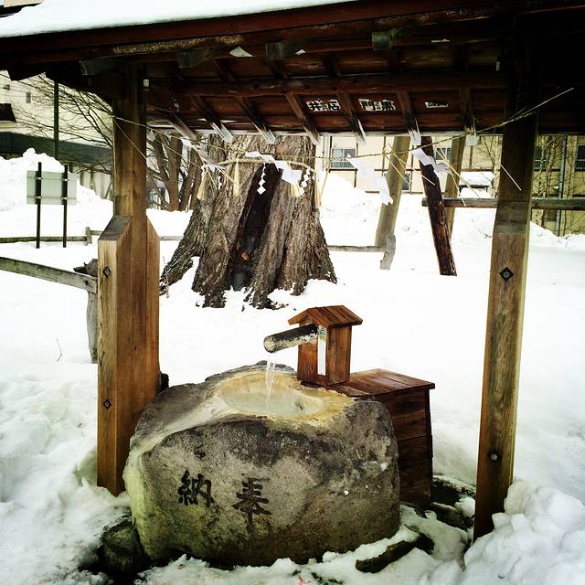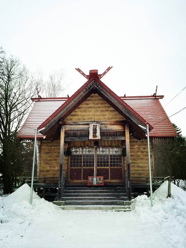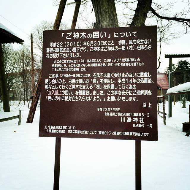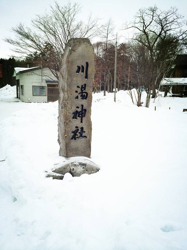 川汤温泉第二天,开始下雪,一看天气预报,发现到周末都将是雨雪天气。登硫磺山的计划只能泡汤,一天的行程就变得十分松散休闲。早起先泡汤,吃早餐,十点过了出门,路上的店铺没一家开门的,看到一家买雨靴的店,打折力度巨大,一双短统带毛的折合人民币才一百左右,这种雨雪天穿正合适,可惜不营业,只能等明天再逛。昨天买过纪念品的小店,今天也不开门,想再进去看看,拉开门,打了好几声招呼,老板竟然不在,店门就这么掩着也不锁,难道她不怕有小偷偷盗?哪怕是旅客顺手牵羊也是分分钟的事,她居然都不管!不只这家店,整条商业小街的所有店铺几乎都是如此,不做生意没人应,也不锁门。这治安!从酒店到川汤神社五分钟路程,神社这时节也不开门,就在外面兜了一圈。其实神社的外景和中国的寺庙差不多,也有苍天古木,旁边的牌子上写着品种和历史,就是没有香烛供奉,只有一个架子上系了一排排的许愿纸条,旁边是洗手池,通着温泉水,刻着两个字:奉纳。估计是要敬献神灵得先把手洗干净了。那个系心愿纸条的架子样子古拙,上面的纸条一律白纸黑字,本也想把愿望写下系上,可惜神社关了就没法拿到纸笔,只能抱憾而去。