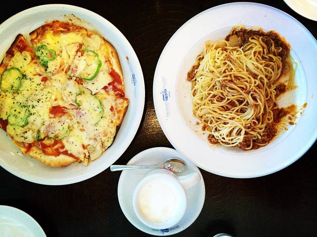 车站候车室左侧是一个足汤,右侧就是一个小型西餐厅兼咖啡馆。我们当即决定在此用餐。餐厅的设计很古朴,餐点都是当场烘培,我们点了一份披萨和意面,一杯维也纳咖啡,折合人民币110左右,还是不贵,且十分好吃。吃完,请热情的店主帮忙叫车去温泉度假村,因为是淡季,没有巴士,只能叫车。在日本出租车还是比较昂贵的,起步费大概就要人民币20几元,冬天还要加钱,如果是旺季去,就可以做到四通八达的巴士,这是淡季游北海道唯一的不便。