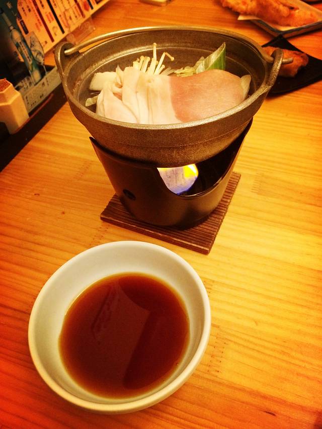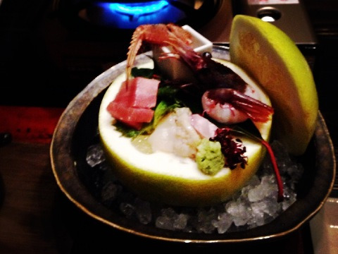 不但虾,海蟹也几乎是半生不熟地吃,把整蟹适当分解后放在小火锅里,点上酒精蜡烛,蜡烛燃尽锅汤正热,蟹还是半熟,部分蟹肉仍是半透明的,就这样吃,服务员不会再来给你添火的。我注意到,蘸生鱼片的酱油非常少,芥末却多,也就是说,你不可能像在上海的日料店那样指望边上有个无限供应的酱油瓶,然后把生鱼片都蘸得足够咸,咸到吃不出生鱼本来的味道。
