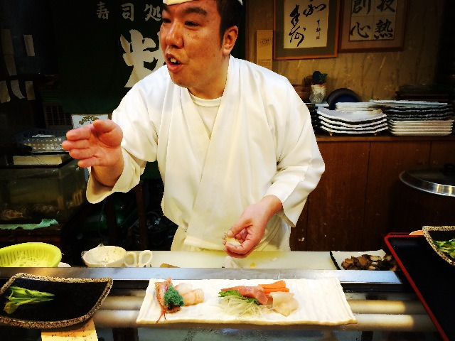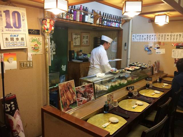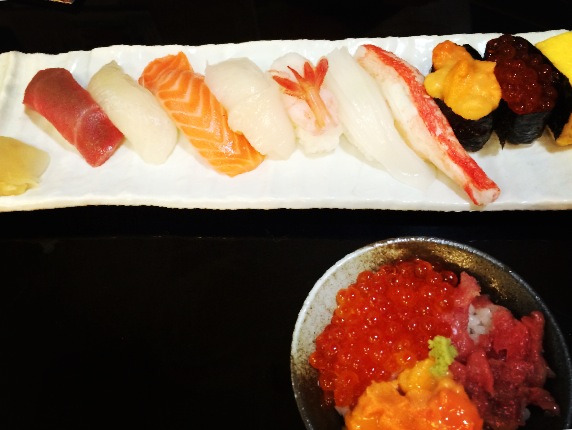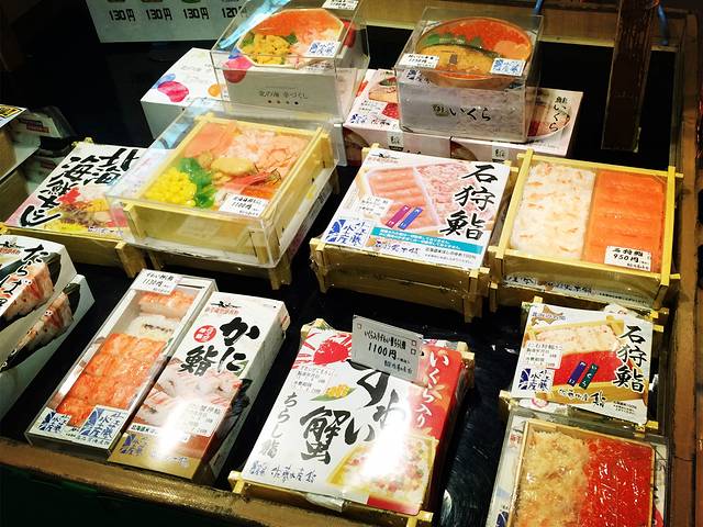 说到吃,小樽的寿司是非常著名的,但因为我的懒惰,去之前并没有做好足够的功课,只是路过一家安静小店时觉得环境简朴,就成了这家寿司店的第一位客人。可能懒人也有懒人的幸运吧,入内才知店里对着料理台的一排位置早已订满,楼上包厢也都被预订了,剩下的只有左右两张四人桌,是和式的,正合我意,就坐下了。没想到这样一家小小店生意如此火爆,那食物应该也不会难吃到哪里去的。事实上确实如此,太新鲜的生鱼片,让我忍不住吃了此行最贵的一顿晚餐,点了生鱼片拼盘和寿司拼盘后仍不足够,加点了一份生虾,虾的名字不知道,总之很甜糯很好吃。老板兼大厨因为我们是最先进来的客人,还赠送了一小碗海鲜饭,上面铺着海胆,鱼籽和碎生鱼。我发现在日本好像私营业主都会对所谓的第一个客人特别优待,在川汤温泉时买木刻纪念品,也被赠送了一个和服小女孩的挂件,看来以后逛街吃饭都得趁早哈!