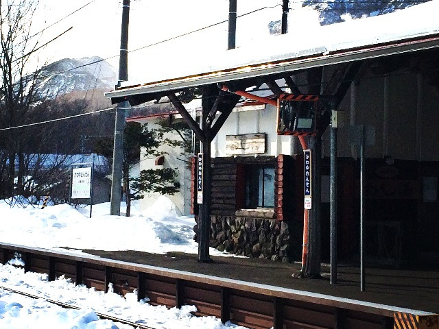 火车驶进森林,车道两边的地势渐高,目的地就在眼前。到川汤温泉已近中午,小车站还是原始的木质结构,没有封闭,简简利落地在那里。天气很好,拍照留念。