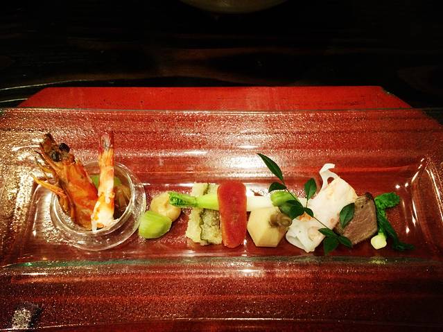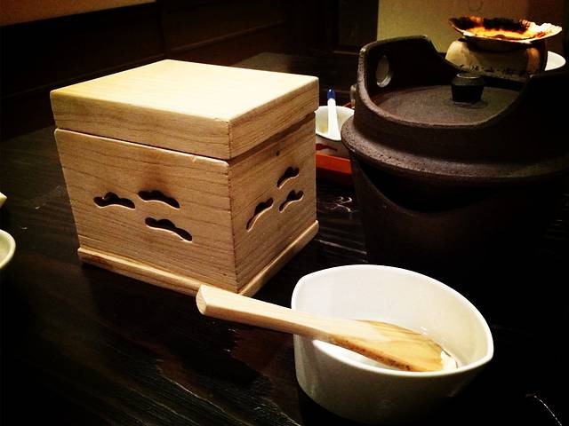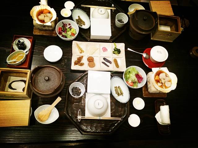 正餐的用餐时间也很长,开吃前,服务员会告诉你这一餐大概需要多久,然后一道道慢慢上菜,不快不慢,通常是等你吃得差不多了,帮你收拾好使用过的餐具,添上干净的。说到餐具,这是另一个刷新我概念的细节,虽然我也爱美丽的餐具食器,但也仅限于让它尽量与实用两者兼有,而日料的食器繁复多样美丽优雅到如此地步,甚至为了美丽故意弄得麻烦,甚至都让我觉得浪费了,他们也毫不在乎。每道菜的食器都各有特色,绝不重复,造型有的古朴,有的奇巧,材质和颜色的配合天衣无缝,一个倒圆锥形的巨大青瓷碗,只放几片牛肉,一个成套的木盒,中有夹层,下面放着炭火,夹层里躺着一片海苔,只有一片!上面盖着木盖子,就为了把海苔加热让它能保住软糯的米饭。不同食材的品种做法,生、烧、蒸、扬,都配备不一样感觉的食器,材质也不同,除了青瓷,还有粗陶、玻璃、木头,茶碗蒸和味噌汤则一概使用漆器盖碗,敢情这不单是味觉的盛宴,更是视觉的盛宴。我想所谓的文化,当它脱离了实用价值时,必须上升到无用的境地,美才得以显现。我的主妇身份让我不得不联想了一下酒店餐厅的后台厨房得洗多少餐具,不想则已一想大惊,这得多累人!但不累就不能显示对食的追求,对美的信仰,不复杂不多余就不能成艺术,这是我们这些被现实生活所困的都市人永远向往却永远道大不了的境界啊。