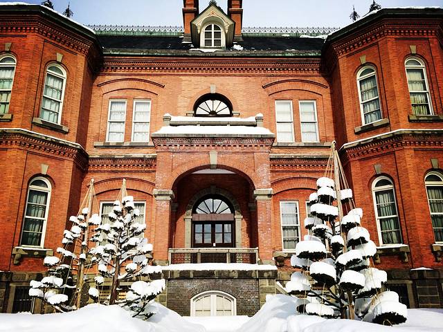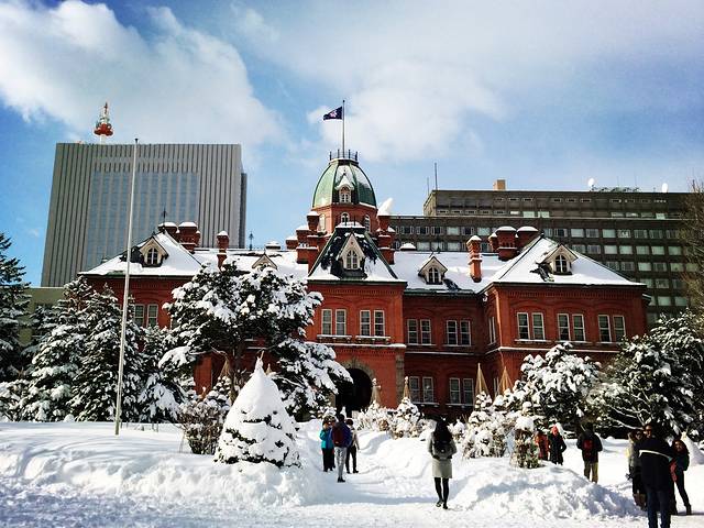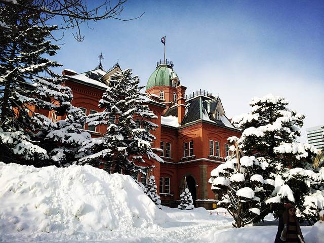对了,去厘小路的路上我们还看到了熟悉的电车,也是换线,是绕札幌商业街和主要景点行驶的,这和香港的电车很想啊,顿感亲切。另外,也顺道逛了下北海道厅,因为离狸小路很近,所以就溜达去了。这是一个行政机关,地图上的照片也十分美丽,典型的西式建筑,红屋瓦房,不少游客在调试单反相机,我用手机随便拍几张渣图,也是张张美丽,根本不需要调光。
