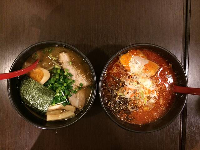 卸了行李先去“拉面共和国”吃晚饭,这个共和国可厉害了,就坐落在JR站五大百货公司其中一家的六楼,里面经营着八家口味各异的拉面馆,各有特色,故称之为“共和国”。这八家店每个月都要来一次淘汰赛,由食客评选,评价最差的就得关门大吉卷铺盖走人,典型的竞争上岗!共和国的每家拉面店里都有宣传册,里面记录着现存和曾经开业过的店铺名字和位置,噱头做得那么足,怪不得地图上都特别做了宣传。我们选了一间看上去人气比较旺的店铺,很幸运不用等位,占了最后一张桌子。拉面的价格很公道,味道也的确好,有大中小三种分量的选择,男士估计得选大份的才能吃饱。