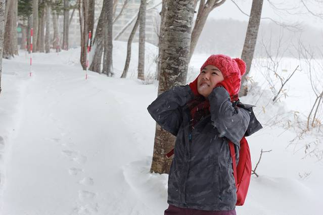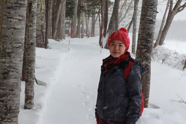 一早,吃过早饭,再次把自己泡干净清爽了,离开阿寒湖。酒店的大堂依然静悄悄的,落地窗外还是一样的白雪皑皑,我们也是轻轻来去,好像什么也没有发生。工作人员麻利地结账,帮我们把行李搬上巴士,送我们上车。走过大门处长长的走道,影影绰绰,心里一万分不舍,但还是要回去的。