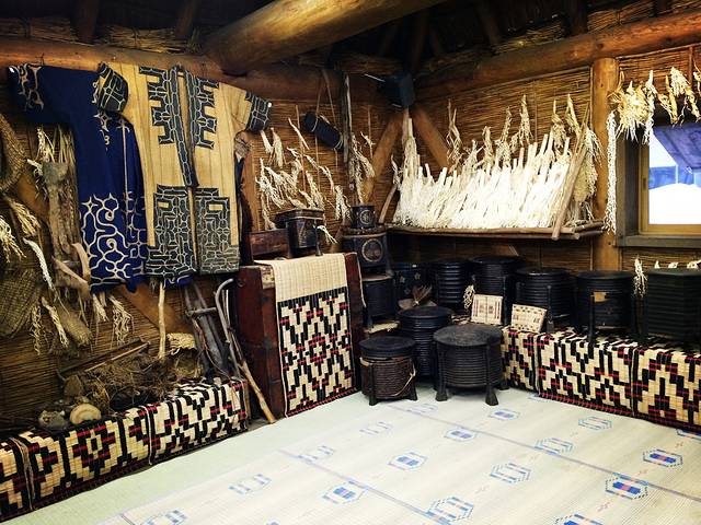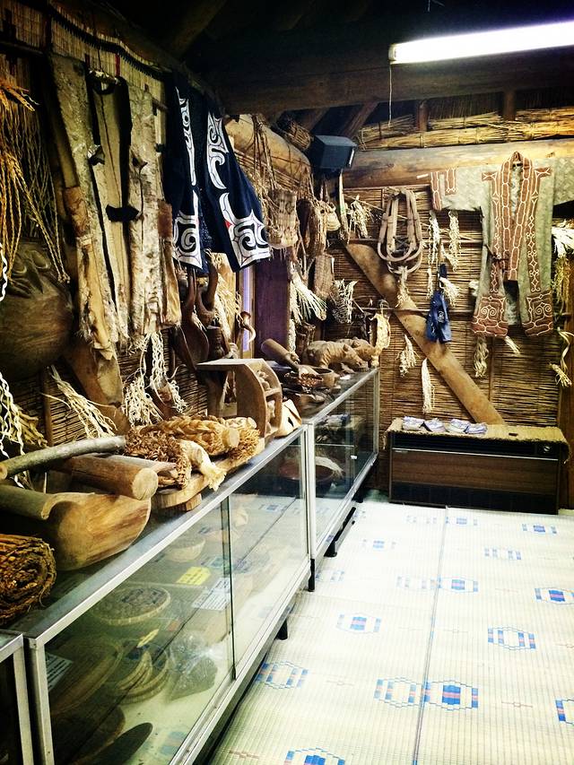 街的尽头是一个阿伊努族的神社,旁边一座矮平房是展示其族人早年生活用具的生活馆,没有固定的门票价格,自己往门口的箱子里扔几个银币就能进去看。馆内就一间房,装饰得十分原始,还烧着炭。作为少数民族,阿伊努的手工制品也有别于传统日式的简洁和克制,显得有些粗放,色彩和图案都更加华丽,这和我国少数民族的艺术特征是相似的。