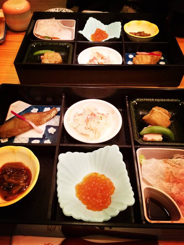 一般的温泉酒店都可以包半餐,一想到美味的怀石料理,此行就索性都包了半餐。其实在川汤温泉时已经吃得很好,两天的晚餐菜色都不一样,生食,蒸物,烧物,扬物,味噌汤,茶碗蒸,糯糯软软的米饭一样不少,且专有和式包厢,用餐完全不被打扰,这样子吃,在上海一顿两人没四五百拿不下来,但我们两住两天吃四餐(早餐是日式和西式混搭的自助)加无限制泡汤才一千五不到,性价比高到直接捂着被子偷笑。