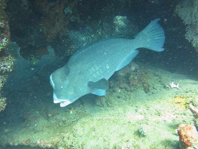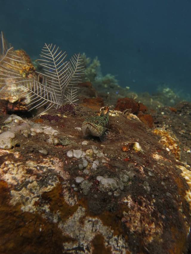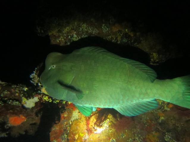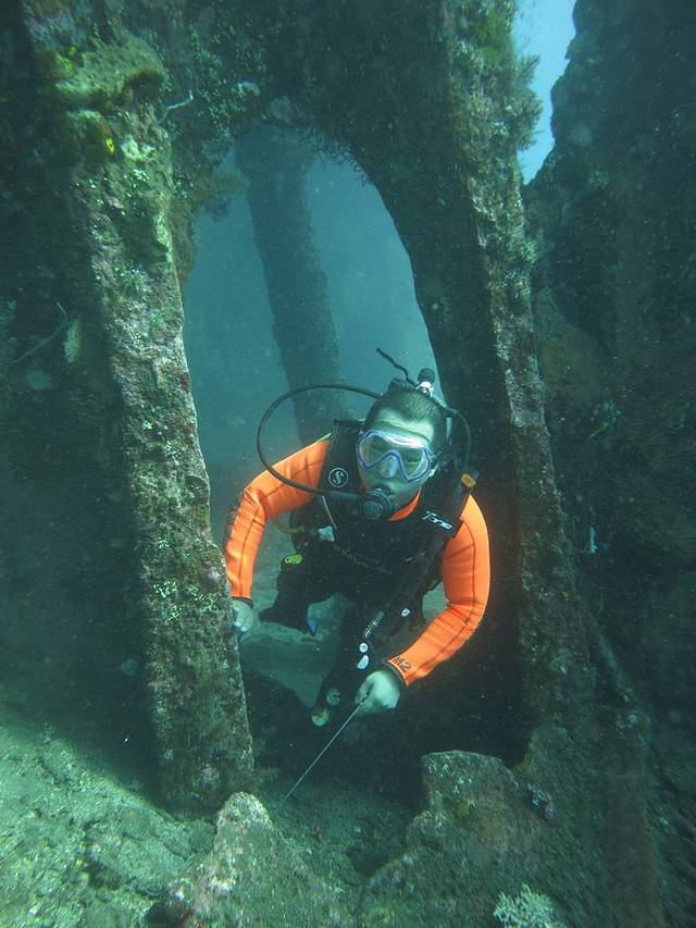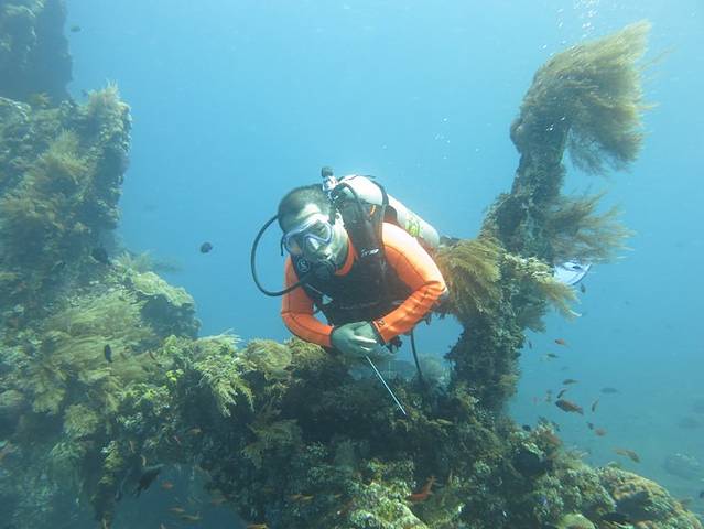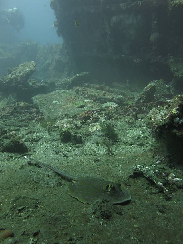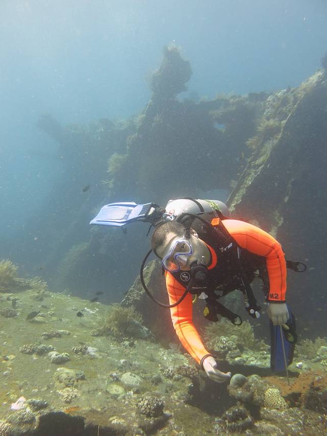 我们住的房间也还OK,有空调,打扫的很干净,每天还有人打扫,安全性也不错。25刀一晚一个人的价格还是比较值的。图兰奔的晚上非常的安静,据同行的教练说这个小镇也就是因为有了潜水才热闹起来的。今天安排了三潜,两个日潜一个夜潜,图兰奔的水下环境还是不错的,也没什么流,只有一些浪,不过也算正常。但刚开始面对浪反而有些不适应,中性浮力一般,慢慢适应就好了。最吃不消的还是从潜店走到潜点的这段路,由于是岸潜,都是从岸上穿好装备下水。当然都是由当地大妈头顶着装备放到下水的地方,不用我们搬,但是这段路全是大号的鹅卵石,来回都可以让你做一次免费的足底按摩,且终身难忘。这里也没有沙滩,只有黑色的火山灰,水下的沙地上也是火山灰,水下可看的东西挺多。除了有沉船,还有最出名的龙头鹦哥,大号的石斑,狮子鱼等等。就是没有看到海龟。沉船其实没有二月去菲律宾科龙看到的沉船大,科龙的沉船很多是二战时期日本的战斗舰,规模比美国自由号大很多,内部结构也更复杂一些。但这里的水下能见度很好,很适合拍照,所以第二天我毅然决然的找当地小黑租了一个水下相机,这个后面会讲到。来几张潜店的照片这里的黄昏很美,夜晚很安静