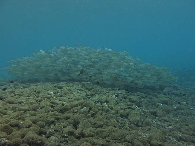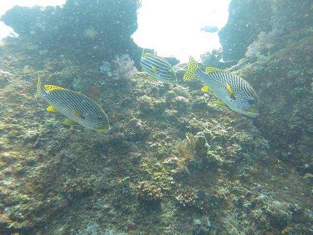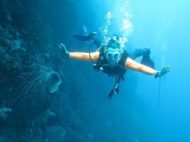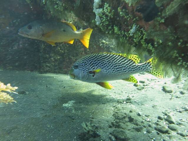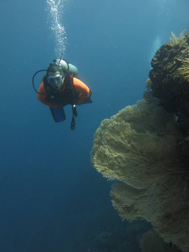 两天的潜水都是在三个岛之间。要提醒菜鸟们,这里潜水可看的东西很多,但流也非常的大,我们四次潜水,基本上都碰到流,其中有三次还是中高强度的流。学潜水以来我还是第一次碰到这么强的流,先开始还有点紧张,但后面适应以后就完全享受在流中了,因为顺着流基本上不用游动。本来想租相机,可惜潜店租相机的人出国了不在,所以没有租成。水下环境其实感觉不如图兰奔,很多珊瑚已经白化了,但鱼类并不少。SNAPPER、Triggerfish(会攻击人)、海龟这次一共看到了九只,真的很赞。鱼类丰富以至于我在点菜的时候就觉得这鱼好熟悉,在水里就念叨着这鱼可以吃的哦。哈哈。我是真正的吃货。第二潜的时候加入了一个美国大叔,美国大叔装备倒挺齐全,在跟大叔交流中得知大叔一家人都挺喜欢潜水,他的小儿子还去船潜。一条船上就我们俩中国人。今天又有小伙伴加入,中午就在潜店的餐厅吃的饭,住在他们家吃饭也可以打折。