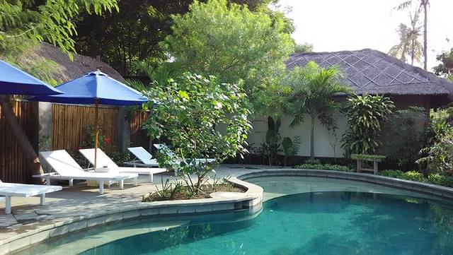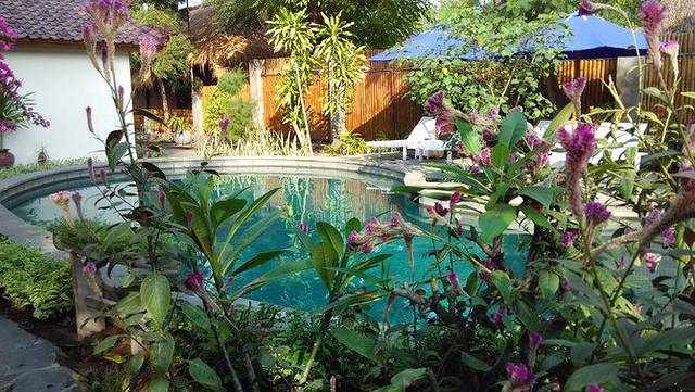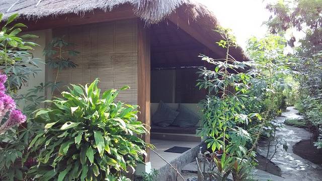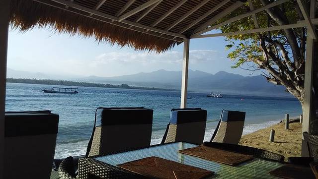 第五家是在GILI AIR岛上的manta dive resort,也是因为潜水才住在这家的,一共住了三晚。老板是个英国人,直接发邮件预订的,然后用的PAYPAL预交的一半订金,这家还挺火的,他们在GILI三岛上都有店,后来有小伙伴想去订还没有了。然后这家的订房政策也很有意思,我到后来才弄清楚,这家店每晚房价是900K每晚,但如果你要在它家潜水,房价还可以打9折,也就是810K每晚。然后潜水也可以打折,每潜是370K包含了装备,这个后面潜水部分会在讲到。他们家网址:www.manta-dive-giliair.com, 自己发邮件去问,然后要预付一半的订金。如果英文不好的同学要仔细看哦,千万别把条款看错了。这次就在这个语言文字上发生了点小问题,是中西方人理解上的问题,不过后来老板很NICE,愉快的把这件事情解决了。这个后面会讲到。就连在这里住了以后在他家门口吃饭也可以打9折。房间很OK,有空调,布置的很舒服,房间空间很大,卫生间也非常的大。洗澡间的部分是对着天空的,可以看着星星洗澡,哈哈。没有特别感觉是海水淡化水,我觉得是淡水,但小伙伴说是海水淡化水,我没偿出来。但还是不要喝房间里的自来水啦,会每天送一大瓶饮用水的,喝水不用担心。其实贵还是有贵的道理的。