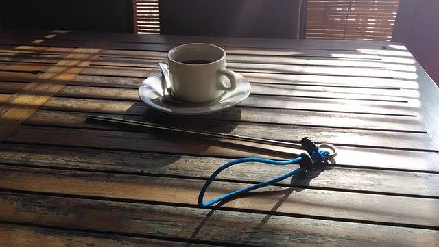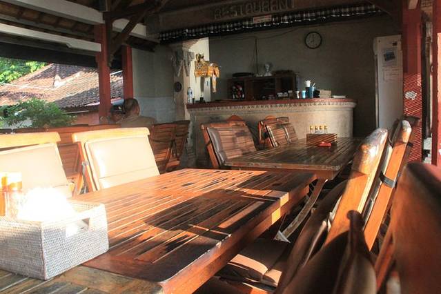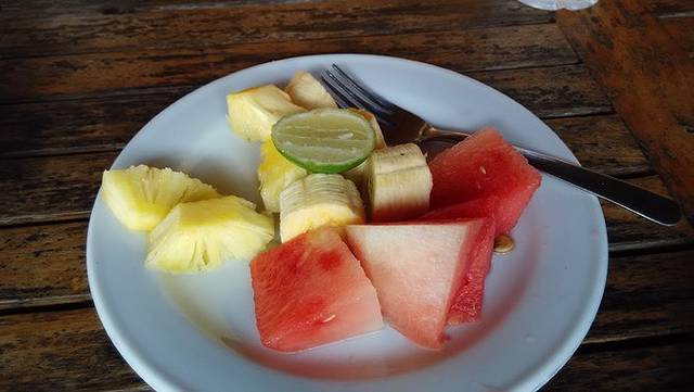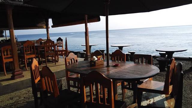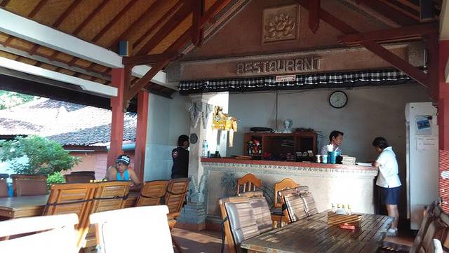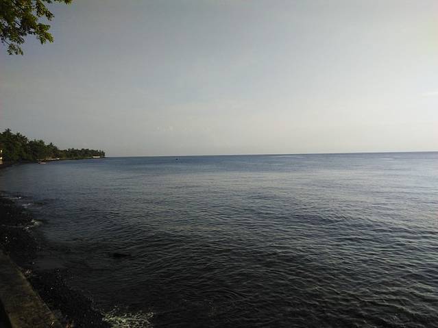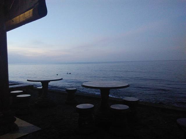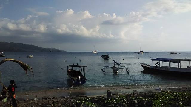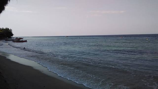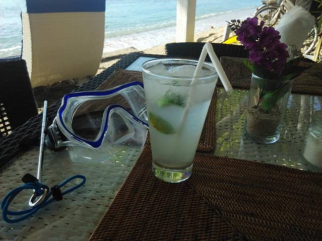 约好7:30到酒店接,司机晚了大概15分钟才来。早餐也没吃,酒店旁边真的没什么可吃的,就在酒店楼下的超市买了点饼干和牛奶。司机先是把我们送到了潜店的办公室,从库塔海滩到潜店办公室大概也就20分钟的样子。在潜店先把余款交掉,然后见到了同行小伙伴的教练和我的潜导,我的潜导是个当地小黑,人很好,笑呵呵的。当地名字翻译成中文叫“桑塔”,但他说中国人都管它叫“圣诞”,所以我就记住了,只要叫他圣诞他就答应。然后同行的还有个中国小伙伴,他是去考专长的,一口气考了5个。所以感觉去图兰奔潜水的就我们仨中国人,人好少。从潜店到图兰奔要2个半小时,有些山路,所以感觉 312刀含路费是很值的了。到了当地也发现确实人不多,有潜水的基本上是老外和日本人。在这里潜水真的好舒胡。到了潜店第一件事情就是吃午饭,我们的费用里含了两顿午餐,吃的也不错,每人可以点一份饭+菜,在点一份喝的。看上去不是很好,但味道其实还不错,印尼菜在我的心目中顿时排在了泰国菜之后,排名东南亚菜第二名,比菲律宾和马来菜好吃多少倍。特别是牛油果冰沙,强烈推荐,20K一杯非常的实惠,建议大家多喝。当然我们的餐里如果含了饮料必点这个,但很多时候没有牛油果,在巴厘岛其它餐厅很多时候也是没有牛油果,在GILI AIR的时候一直没有,只能作罢。