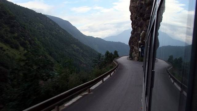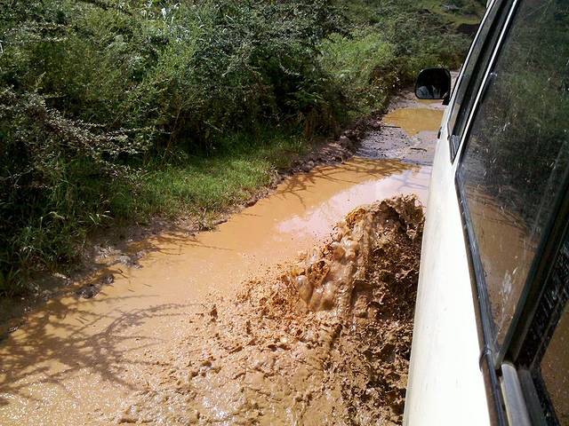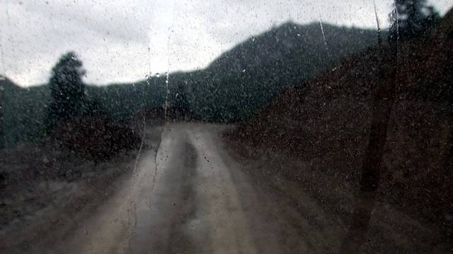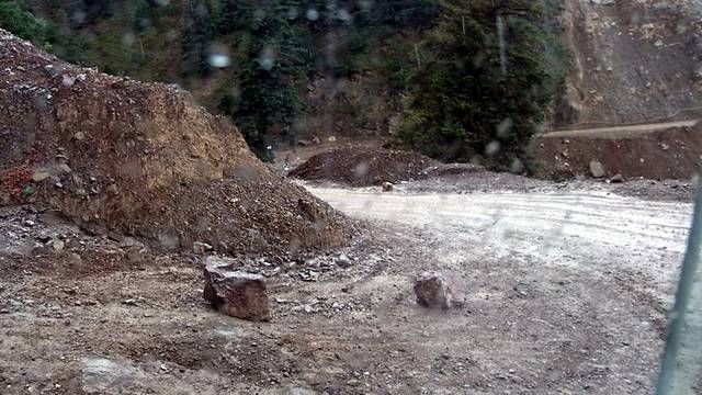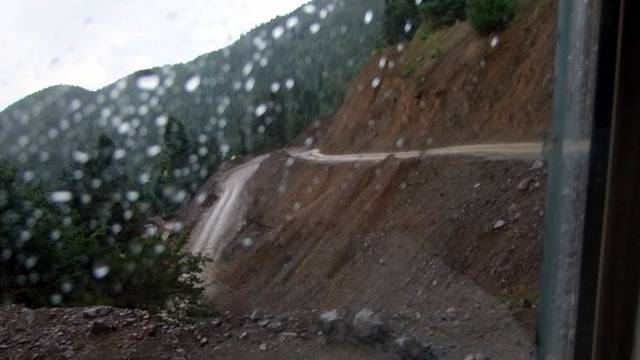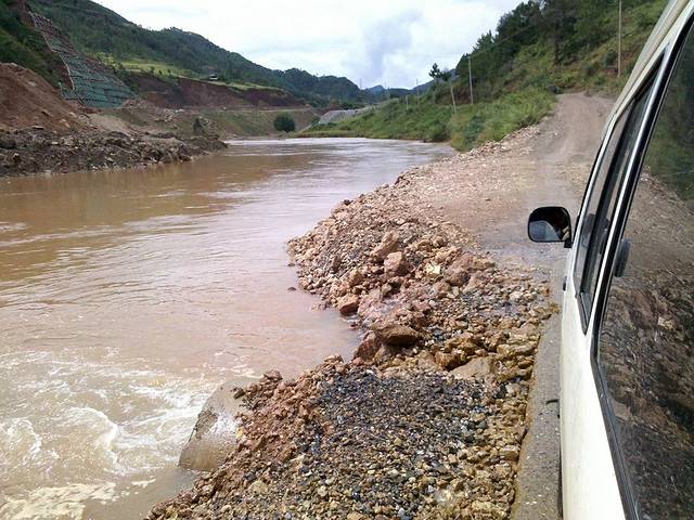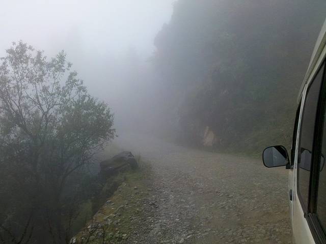 土路……目测仅能容纳一部车的宽度……路面无护栏……雨天……各种山体滑坡的痕迹……180度大拐弯……山下是深渊……