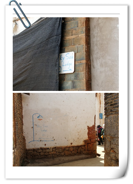 走5分钟公路,到达天梯客栈。交10块钱过路费,寄存部分行李(能寄的全寄掉)。天梯下去险的很,我一度认为没路了,却又会出现你难以想象的