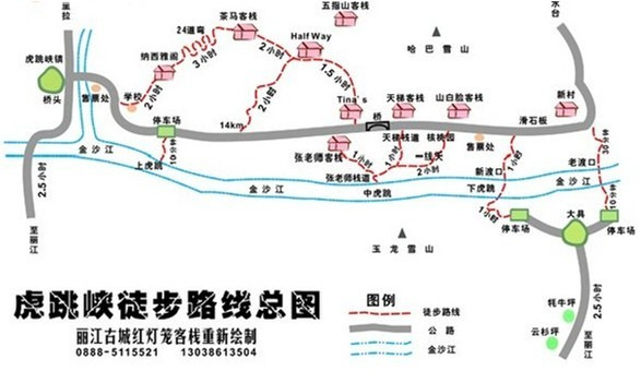 注1:丽江古城国际青年旅舍(0888-5180124、5158123)有去虎跳峡的班车,单程35元,到虎跳峡镇桥头。