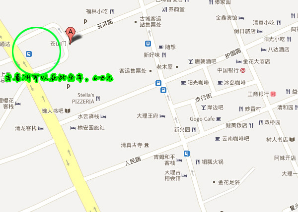 这张是大理古城(偏西方向)的地图。如果要从大理古城去喜洲,可以到图中圈圈位置坐车。