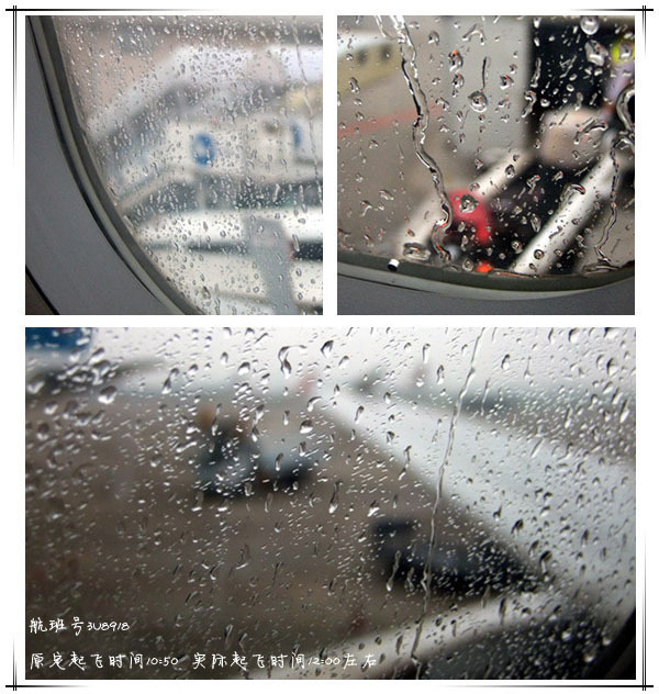 没想到,开始登机的时候下起了小雨,而上飞机后,雨势就越来越大,整个机场跑道开始积水,原定于10:50起飞的飞机,因为天气原因延误了大约有1个小时左右。