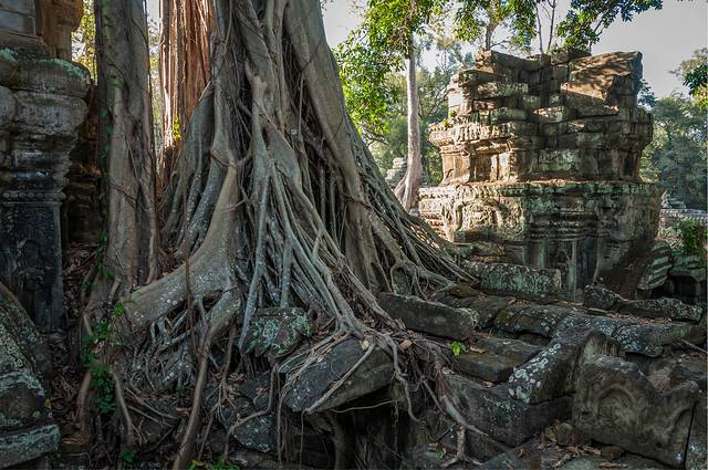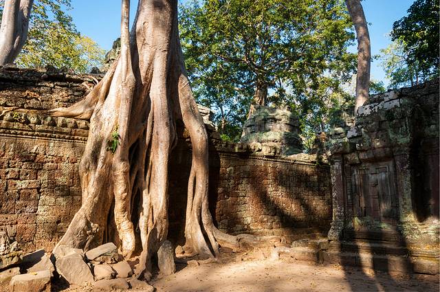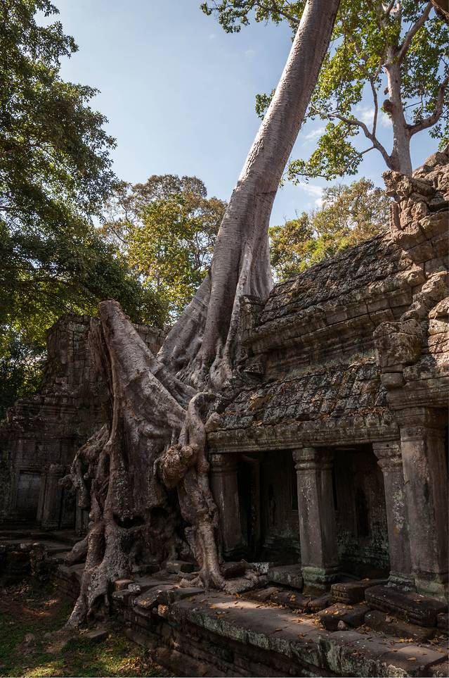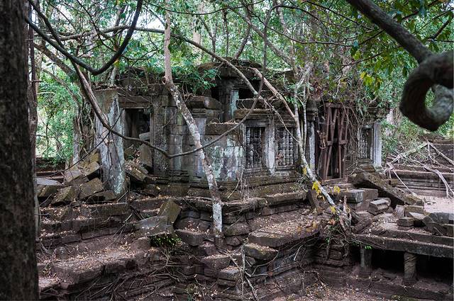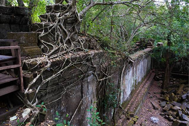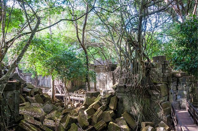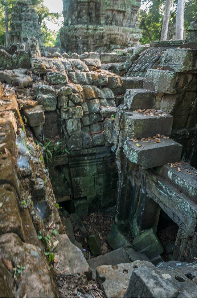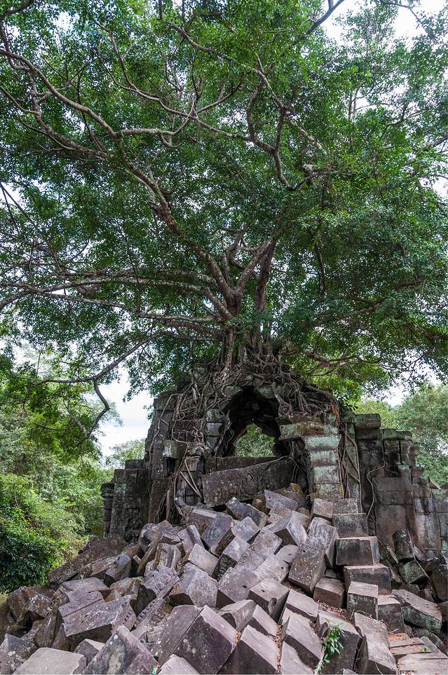 从高布斯宾到崩密列的一个半小时果然很自虐。腿麻了,屁股颠烂了,白色T恤上粘了一层土,掸下来够养一盆花了……强烈建议各位吸取教训,不是万不得已不要走这条捷径。崩密列的门票5刀是单独收的,不包含在大景区门票内。崩密列是一个未被修复的寺庙,所以看到的大多是倒塌的建筑,各种乱石堆砌,以及石缝中墙壁上的树根藤蔓。跟塔布笼寺的树石相生比起来,这里更像是已经完全被古树征服,在坍塌的废墟上往往是一棵古树拔地而起,围墙上也都是爬满了藤蔓。